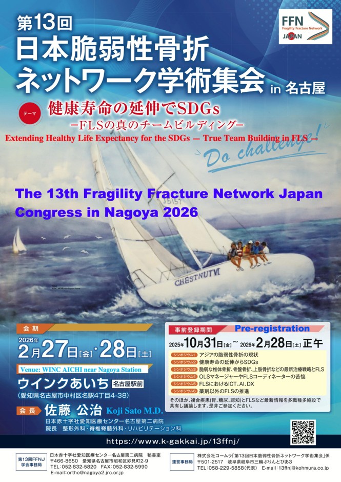 2026年2月27日・28日の両日、名古屋駅前・ウインクあいちにて「第13回日本脆弱性骨折ネットワーク学術集会in名古屋」を開催いたします。